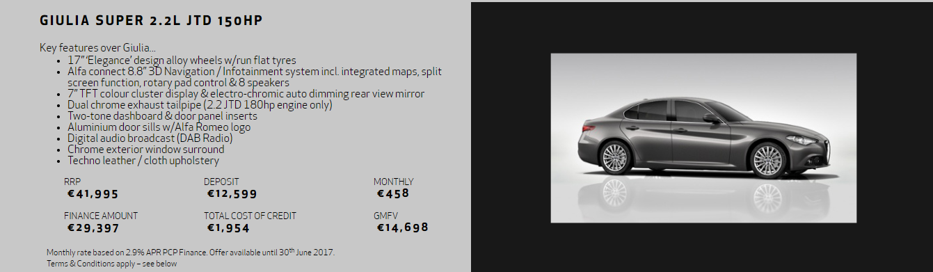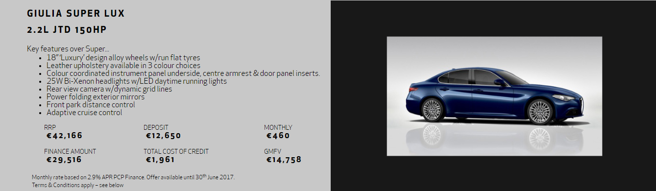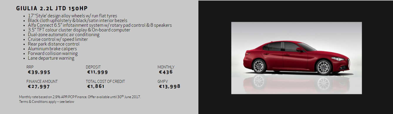 Models shown for illustrative purposes. PCP finance requires Documentation Fee of €75 and Completion Fee of €75. WARNING: You will not own the goods until the final payment (GMFV - Guaranteed Minimum Future Value) is made. Finance is arranged by First Auto Finance Ireland Ltd. the exclusive agent of Close Brothers Ltd. trading as Close Brothers Motor Finance. Close Brothers Ltd. is authorised by the Prudential Regulation Authority and regulated by the Financial Conduct Authority in the UK and is regulated by the Central Bank of Ireland for conduct of business rules. Registered address: 10 Crown Place, London EC2A 4FT. Registered at Companies House no. 195626. Terms and conditions apply. Finance subject to status for applicants aged 18 and over, a guarantee may be required. Finance offers are made under Hire Purchase agreements as defined by the Consumer Credit Act 1995. * Retail prices shown exclude dealer delivery and related charges. Offers valid until 30th June 2017.